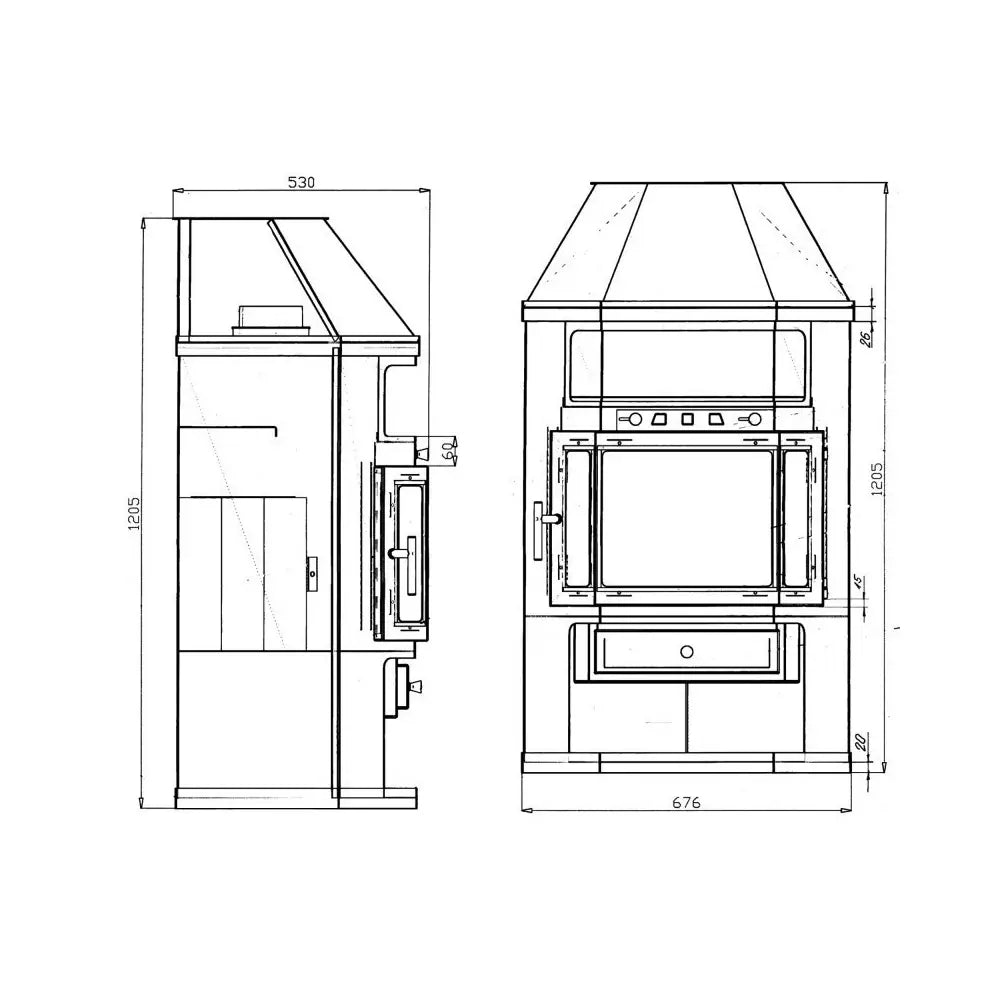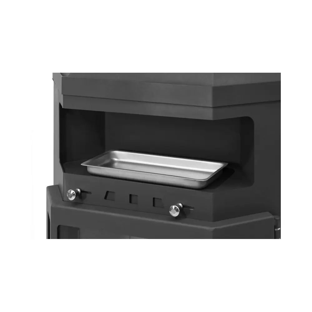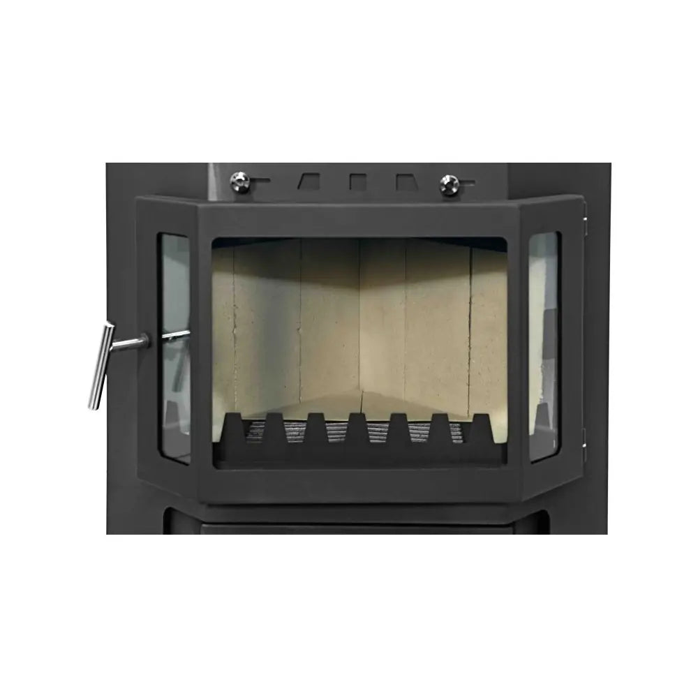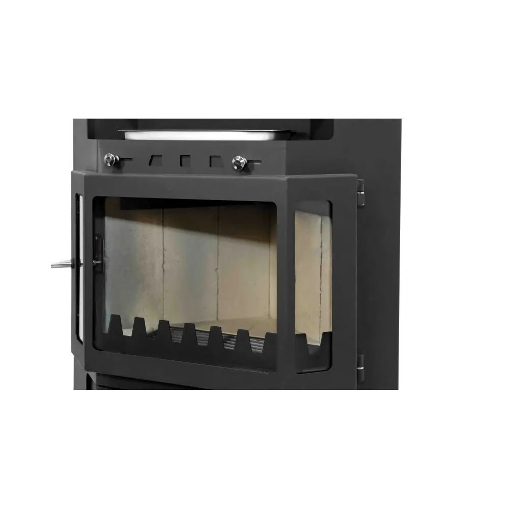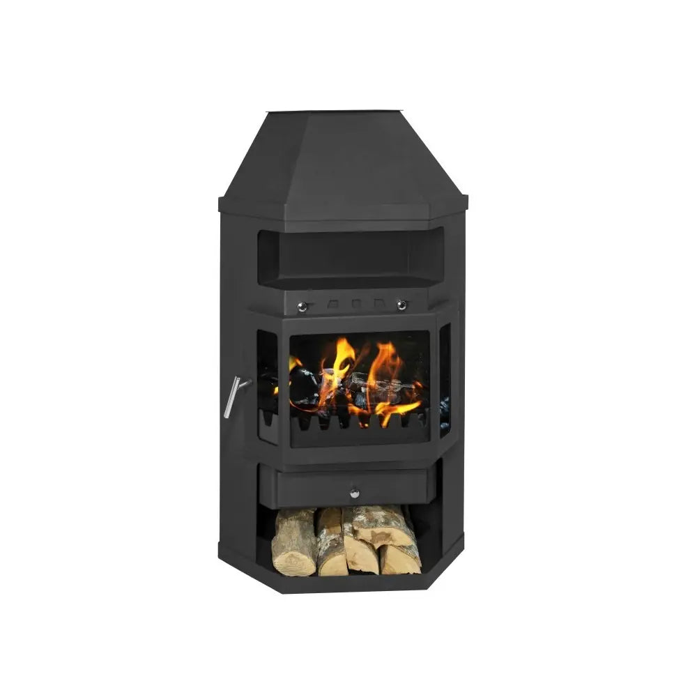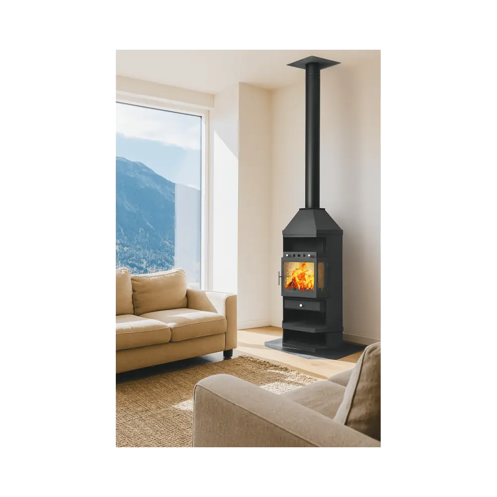 Con leñero en la parte inferior, para tener siempre leña a mano. Cajón cenicero extraíble para facilitar la limpieza. Estufa de Leña con Cristal Cerámico a Tres Caras